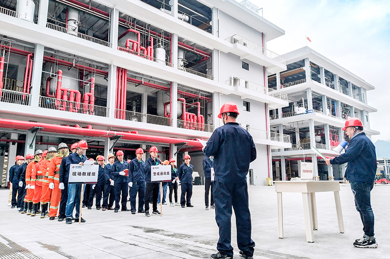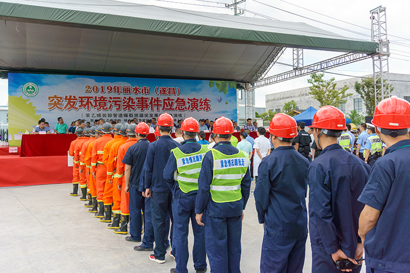 7月19日上午,麗水市 2019年突發環境事件應急演練在我司舉行。此次演練模擬裝卸區在進行苯乙烯裝卸時,由于輸送管道突然爆裂,造成大量苯乙烯泄漏并發生燃燒,泄漏的苯乙烯液體進入廠區雨水管網,同時產生大量有毒有害氣體,并造成一名操作工人受傷。